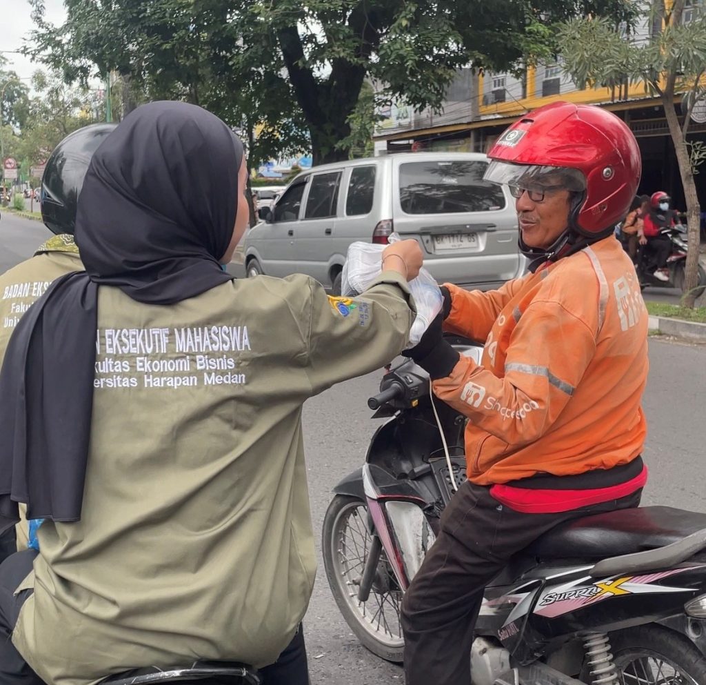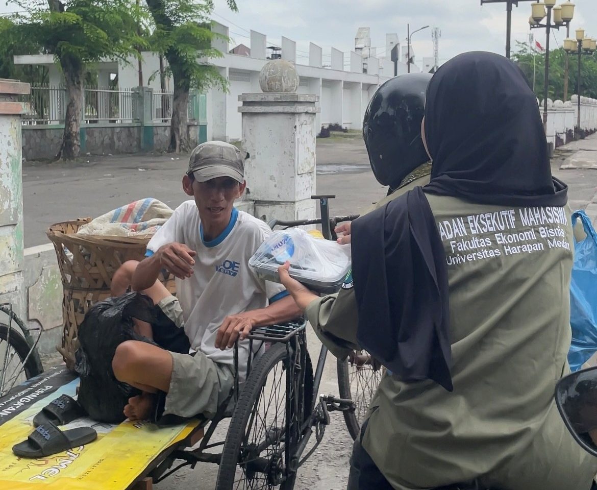 Medan – Badan Eksekutif Mahasiswa Fakultas Ekonomi dan Bisnis Universitas Harapan Medan (BEM FEB UnHar) melaksanakan kegiatan sosial Jum’at Berkah pada Jumat, 17 Oktober 2025. Kegiatan ini merupakan wujud kepedulian mahasiswa terhadap masyarakat sekitar kampus melalui aksi berbagi makanan. Sebanyak 111 paket makanan dibagikan kepada masyarakat di sekitar lingkungan kampus Universitas Harapan Medan, khususnya di kawasan Jalan Imam Bonjol serta kepada jamaah Masjid Abidin yang berlokasi di Jalan Brigjend Katamso.